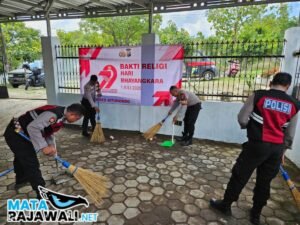 matarajawali.net – Situbondo; Dalam rangka memperingati Hari Bhayangkara ke-79, Polres Situbondo menggelar bakti religi dengan membersihkan Masjid Al-Qodiri yang terletak di Desa Sumberkolak Kecamatan Panarukan Kabupaten Situbondo, Selasa (17/6/2025).