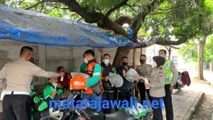 Satlantas Polres Batu saat melakukan sosialisasi dan pembagian helm kepada