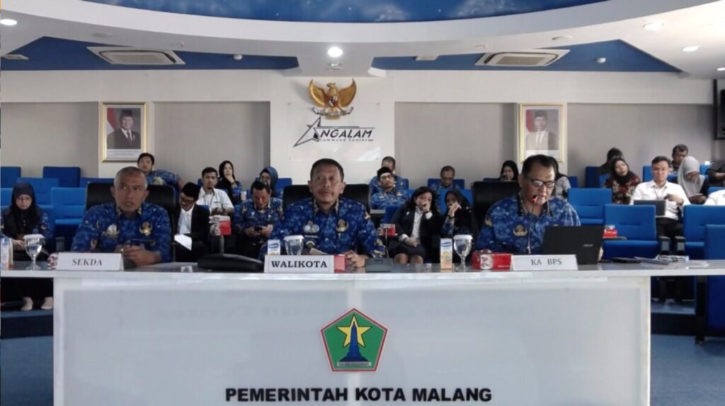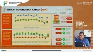 matarajawali.net – Malang; Kepala Badan Pusat Statistik (BPS) Kota Malang, Umar Sjaifudin dalam rilis Berita Resmi Statistik (RBS) yang dilaksanakan secara hibrida dari Ruang Ngalam Command Center (NCC) Balai Kota Malang, Senin (3/6/2025) mengungkapkan bahwa sejumlah acara yang tergelar pada bulan April 2025 turut mendongkrak Tingkat Penghunian Kamar (TPK) Hotel di Kota Malang secara keseluruhan, baik hotel bintang maupun non-bintang.