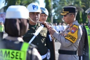 Usai memberi arahan, Kapolres Situbondo AKBP Dwi Sumrahadi Rakhmanto menyematkan pita tanda dimulainya operasi kepada perwakilan personil TNI, Polri dan Dishun selanjutnya bersama-sama Forkopimda memeriksa pasukan apel Operasi Patuh Semeru 2024.(Sup)