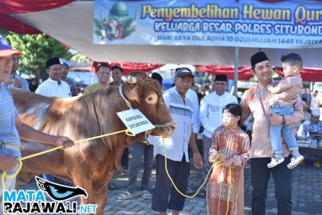 matarajawali.net – Situbondo; Dalam rangka memperingati Hari Raya Idul Adha 1446 H, Polres Situbondo menyalurkan hewan kurban berupa 4 ekor sapi dan 15 ekor kambing, yang dagingnya dibagikan kepada masyarakat yang membutuhkan, Jum’at (6/6/2025).