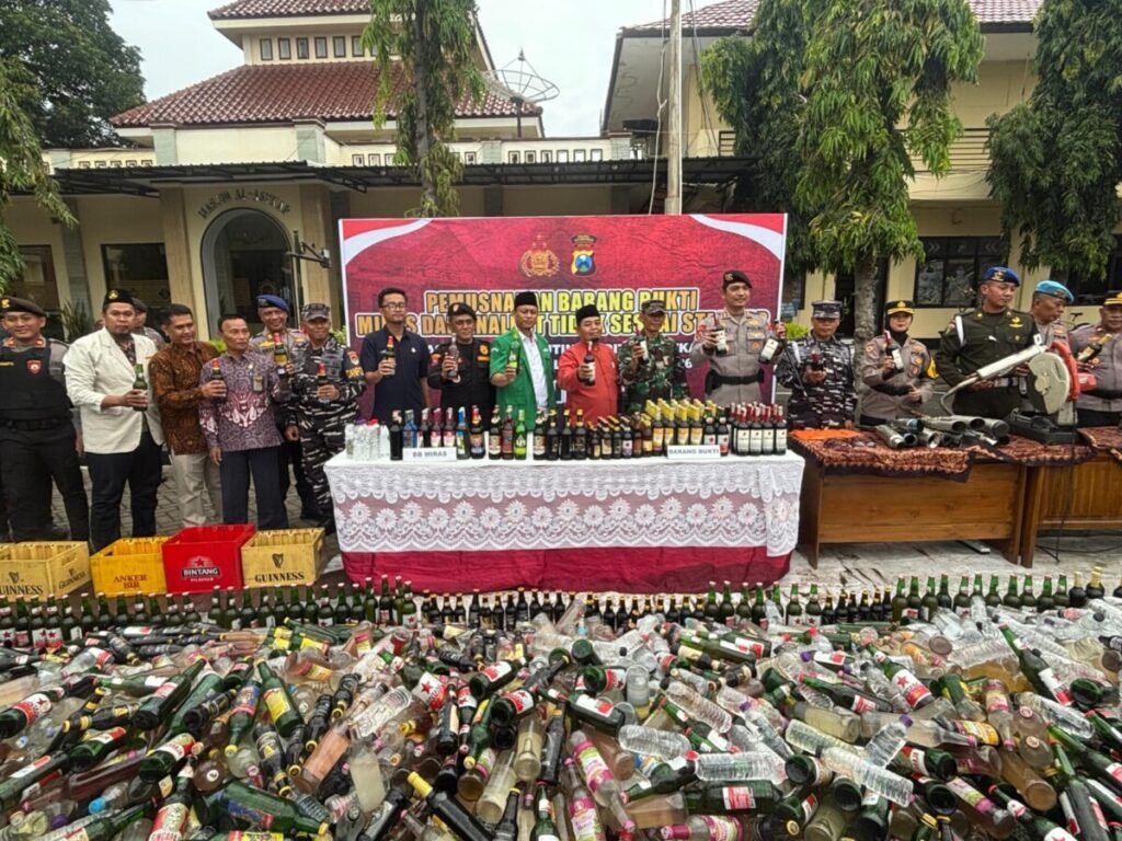 Adapun barang bukti yang dimusnahkan meliputi 2.304 botol minuman beralkohol berbagai merek, 152 knalpot tidak sesuai spesifikasi teknis (knalpot brong), serta puluhan ban cacing yang kerap digunakan pada sepeda motor balap liar dan membahayakan keselamatan pengguna jalan.