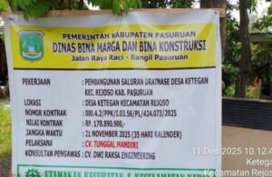 matarajawali.net; Pasuruan — Proyek pembangunan saluran drainase di Desa Ketegan, Kecamatan Rejoso, Kabupaten Pasuruan, diduga dikerjakan asal-asalan hingga menimbulkan keluhan dari warga. Pekerjaan yang merupakan proyek milik Dinas Bina Marga dan Bina Konstruksi tersebut memiliki nilai anggaran sebesar Rp178.890.900,- dengan pelaksana CV Tunggal Mandiri serta konsultan pengawas CV Dwi Raksa Engineering. Namun, kondisi di lapangan dinilai jauh dari standar Rencana Anggaran Biaya (RAB). Kamis (11/12/2025).