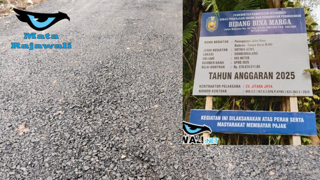 matarajawali.net; Situbondo – Pemerintah Kabupaten Situbondo di bawah kepemimpinan Bupati *Mas Rio* untuk meningkatkan kesejahteraan masyarakat melalui infrastruktur jalan berkualitas kini ternoda. Proyek peningkatan jalan hotmix Ruas Baderan-Taman Kursi (R.84) di Kecamatan Sumbermalang, senilai Rp370.624.511,88, disorot tajam karena diduga dikerjakan asal Rata , mengancam kualitas dan ketahanan jalan yang seharusnya menopang roda perekonomian daerah.7/12/2025