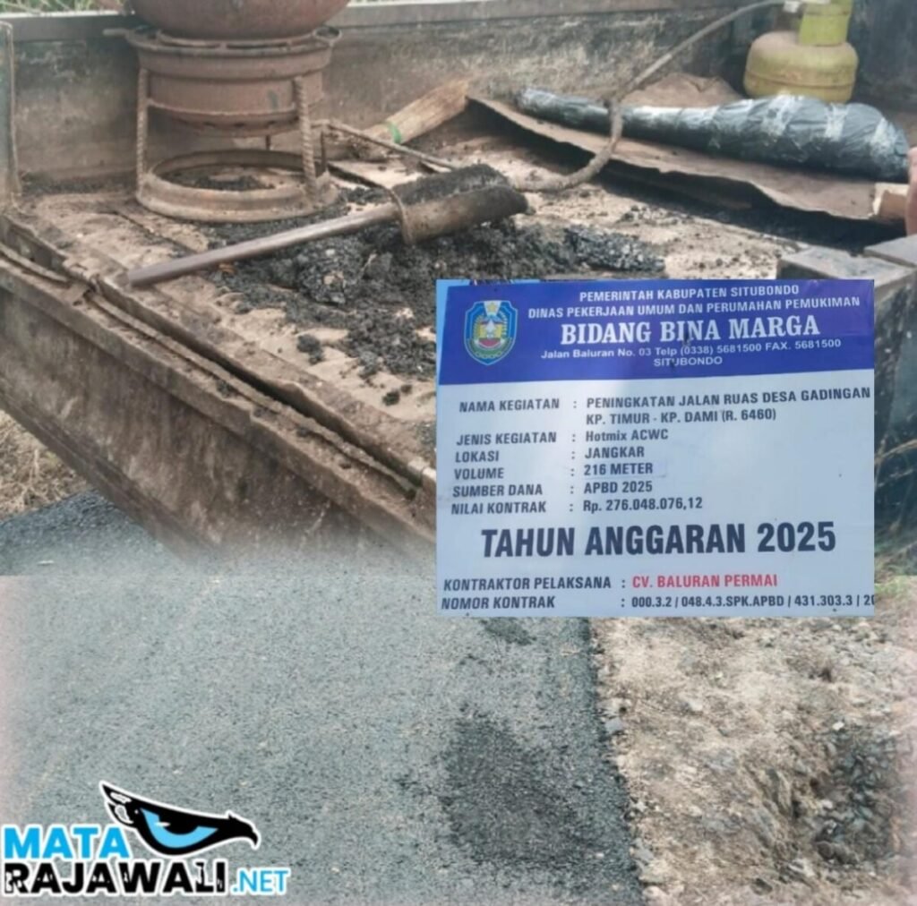 matarajawali.net; Situbondo – Kualitas proyek peningkatan jalan di Desa Gadingan, khususnya ruas Kampung Timur – Kampung Dami, kembali menjadi polemik. Proyek yang dikerjakan oleh CV. Baluran Permai ini, yang baru saja selesai, kini terpaksa mengalami penambalan ulang akibat kerusakan prematur yang mencolok. Kondisi ini memicu kekecewaan mendalam dari masyarakat setempat, yang mempertanyakan integritas dan kualitas pengerjaan proyek.