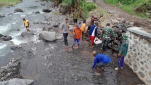 matarajawali.net – SITUBONDO; Bhabinkamtibmas dan Babinsa di Desa Jatibanteng bersama warga gotong royong memperbaiki jalan rusak akibat tergerus luapan aliran sungai.