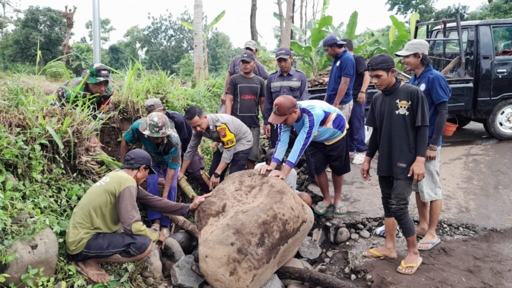 matarajawali.net – SITUBONDO; Bhabinkamtibmas dan Babinsa di Desa Jatibanteng bersama warga gotong royong memperbaiki jalan rusak akibat tergerus luapan aliran sungai.